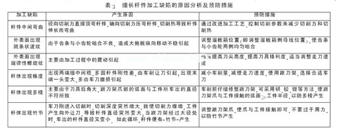 由于細(xì)長(zhǎng)桿類(lèi)零件結(jié)構(gòu)特殊,裝夾困難,運(yùn)動(dòng)穩(wěn)定性較差,因此在車(chē)削中經(jīng)常會(huì)出現(xiàn)各種各樣的質(zhì)量問(wèn)題。全面分析這些質(zhì)量問(wèn)題產(chǎn)生的原因、危害,研究制定相應(yīng)的預(yù)防措施和對(duì)策,可以有效提高桿件的加工質(zhì)量。表3為細(xì)長(zhǎng)桿件加工缺陷的原因分析及預(yù)防措施。