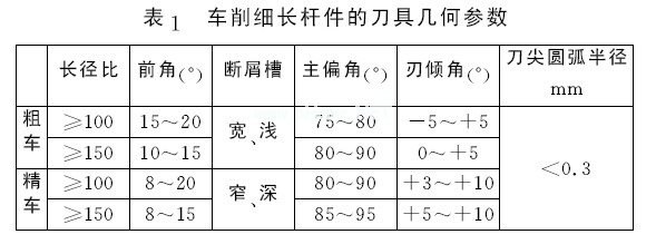 切削速度與切削力成反比。提高切削速度,切削溫度隨之升高,刀具與工件之間的摩擦力則減小,細(xì)長(zhǎng)桿的受力變形變小。但是,如果切削速度過(guò)高,又常會(huì)使細(xì)長(zhǎng)桿因離心力而出現(xiàn)彎曲,,影響切削過(guò)程的平穩(wěn)。因此,切削速度需要控制在適度范圍內(nèi)。桿件的長(zhǎng)徑比越大,切削速度越需適當(dāng)降低。粗車(chē)細(xì)長(zhǎng)桿件的切削用量參考值見(jiàn)表2。
