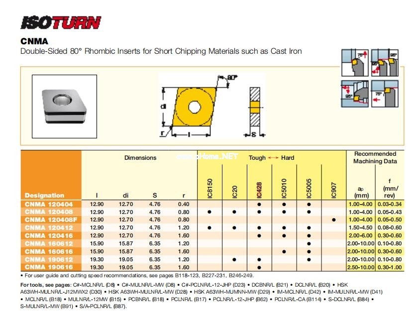 IC428 基體表面附有TiCN/TiC/AL2O3多種涂層材質,CVD涂層。用于在中-高速切削條件下,灰鑄鐵和球墨鑄鐵的車削和切